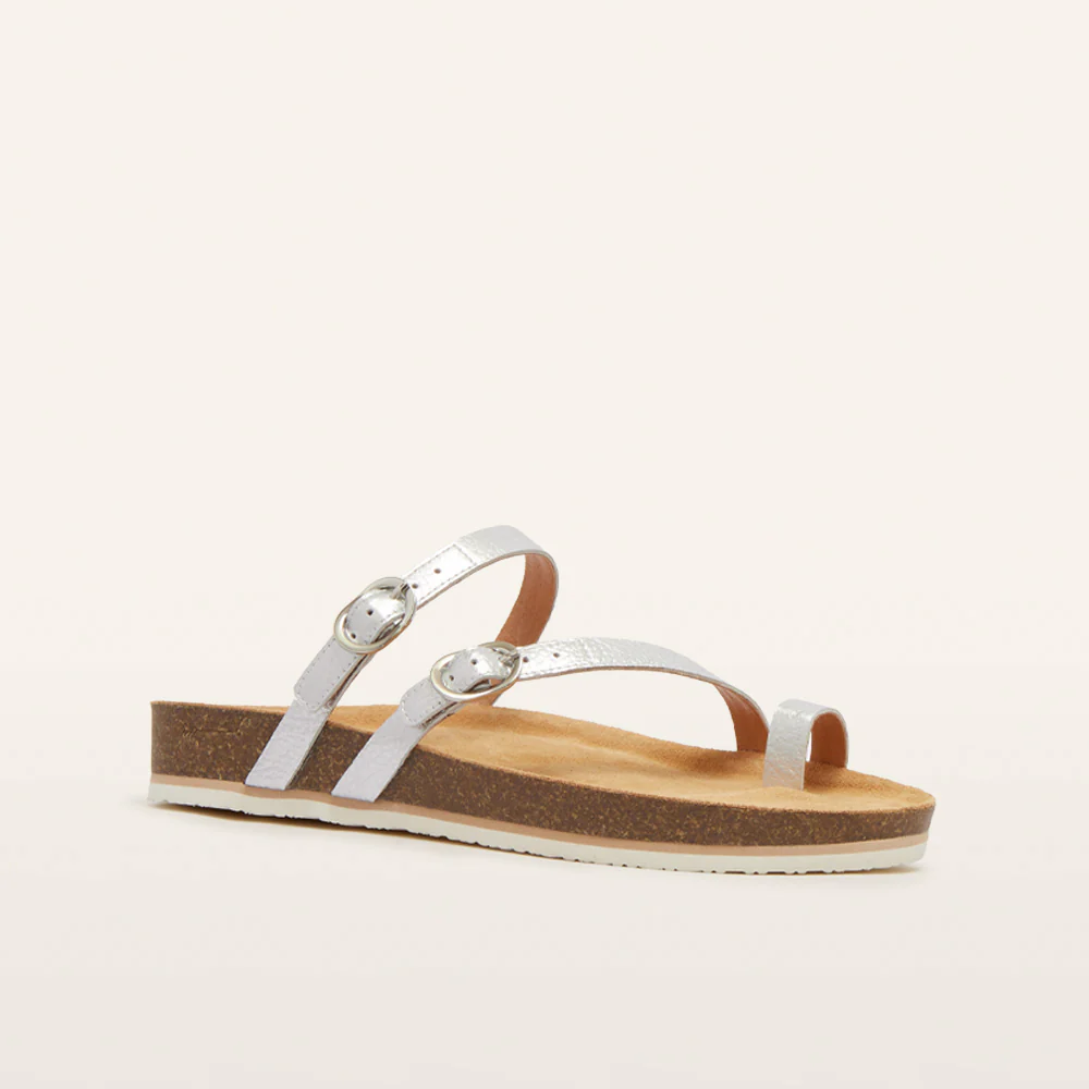 Effortless style handcrafted for sole wellness, Blake is your warm-weather signature slide in eye-catching Silver Tumbled. Blake features a dual layered cushion and support system, soles moulded with rice husk, and our signature footbed finished in soft suede. Fashioned with a leather toe loop and two adjustable straps for a secure fit, Blake is designed for style and comfort on the go.